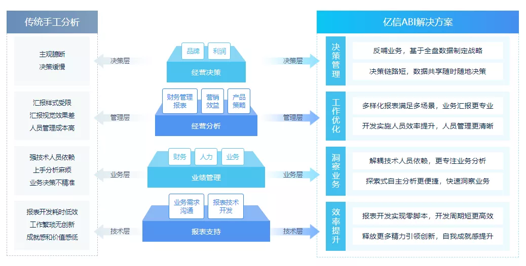 作為國內最早深耕BI領域的軟件公司,億信華辰致力于為政企客戶提供一站式數(shù)據(jù)分析平臺,此次獲獎的億信ABI滿足用戶從數(shù)據(jù)填報、ETL數(shù)據(jù)處理、數(shù)據(jù)建模到數(shù)據(jù)分析、數(shù)據(jù)可視化、移動應用等各個環(huán)節(jié)的功能需求,覆蓋數(shù)據(jù)分析完整流程,幫助用戶實現(xiàn)更深入的業(yè)務洞察力。