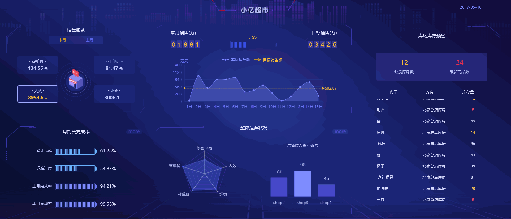 作為BI軟件中的一個重要功能,它以駕駛艙的形式,通過各種常見的圖表(速度表、音量柱、預警雷達、雷達球)形象標示企業運行的關鍵指標(KPI), 直觀的監測企業運營情況,并可以對異常關鍵指標預警和挖掘分析。