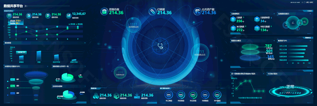 再者,設(shè)計(jì)人員需要明確大屏的視覺路線即展示路線,這條線能講出怎樣的故事跟你的布局構(gòu)圖密切相關(guān)。下面提供幾種常見的構(gòu)圖思路,希望對(duì)大家有所啟發(fā)和幫助。 1、中心放射型 以中間核心內(nèi)容向周圍放射,正中多以地圖和給人視覺沖擊的主視覺為主,起到聚焦凸顯的作用,層次明晰,主次分明。